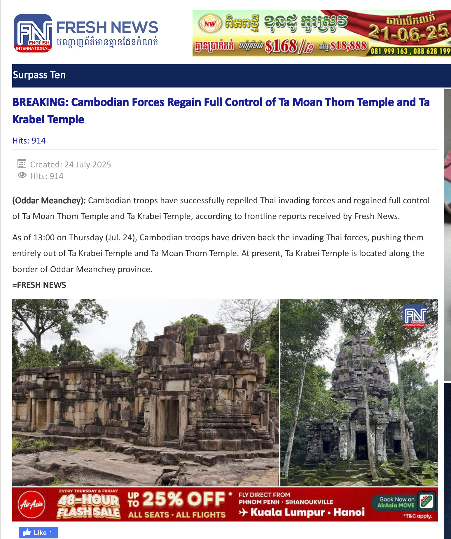 (Oddar Meanchey): Cambodian troops have successfully repelled Thai invading forces and regained full control of Ta Moan Thom Temple and Ta Krabei Temple, according to frontline reports received by Fresh News.